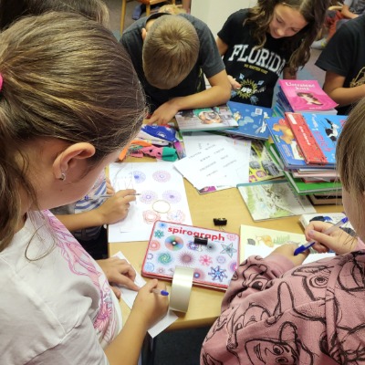 Během výpůjčních hodin jsou pro děti vždy připraveny kreativní aktivity, během kterých si vyzkouší různé výtvarné techniky, například oblíbené pískování s produkty české firmy Radost v písku.
